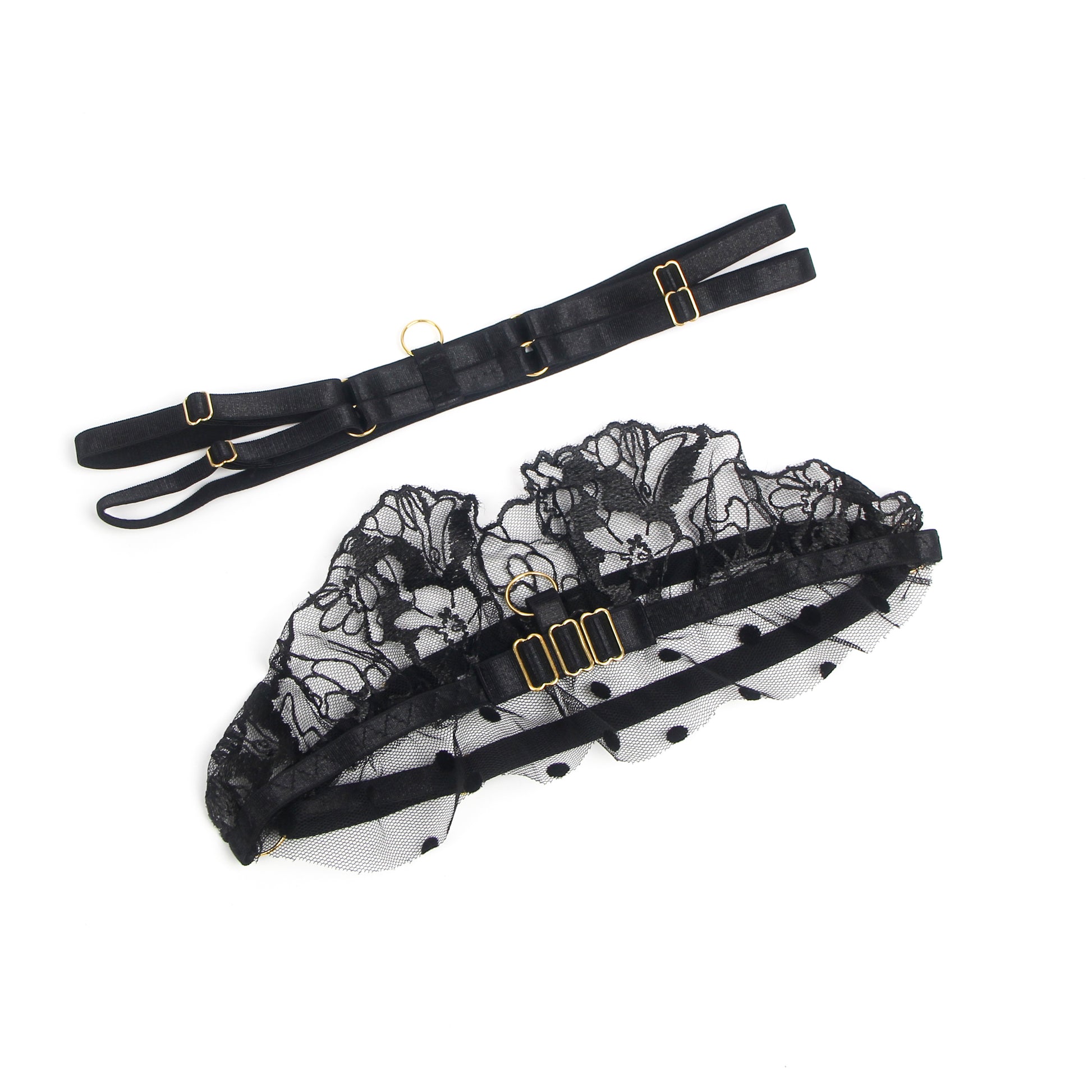 Deze zwarte 3-delige lace ruffle set is afgewerkt met verfijnd kant, subtiele ruches en gouden accenten, compleet met jarretels en beenbanden voor een opvallende, sensuele look.