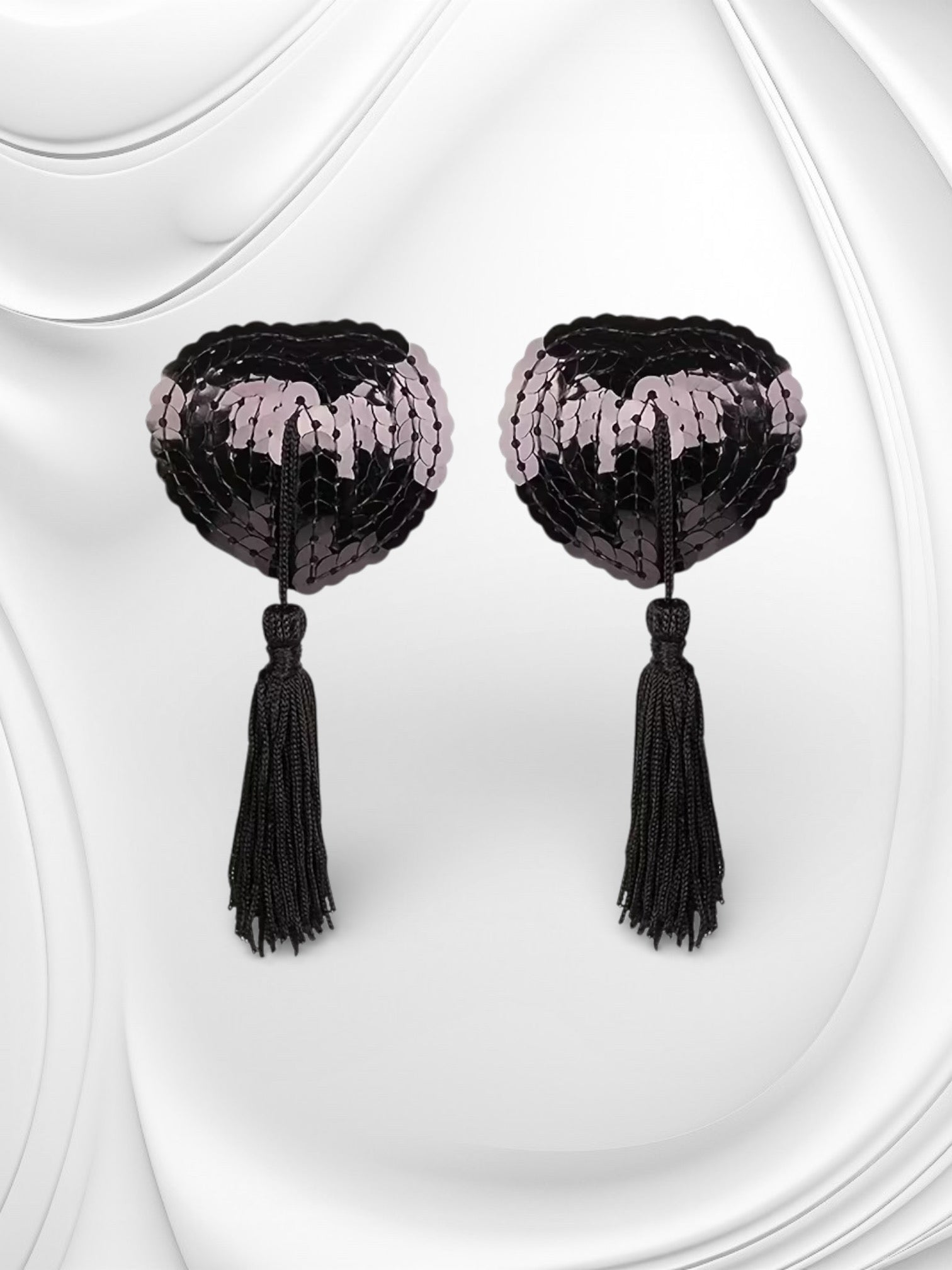 Verleidelijke zwarte nipple covers met glanzende pailletten en speelse kwastjes voor een sensuele en stijlvolle uitstraling.